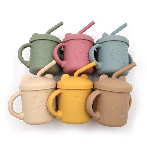 Copo infantil em silicone atóxico com alça,canudo e tampa removível, perfeito para a introdução alimentar e aprendizados de sucção.